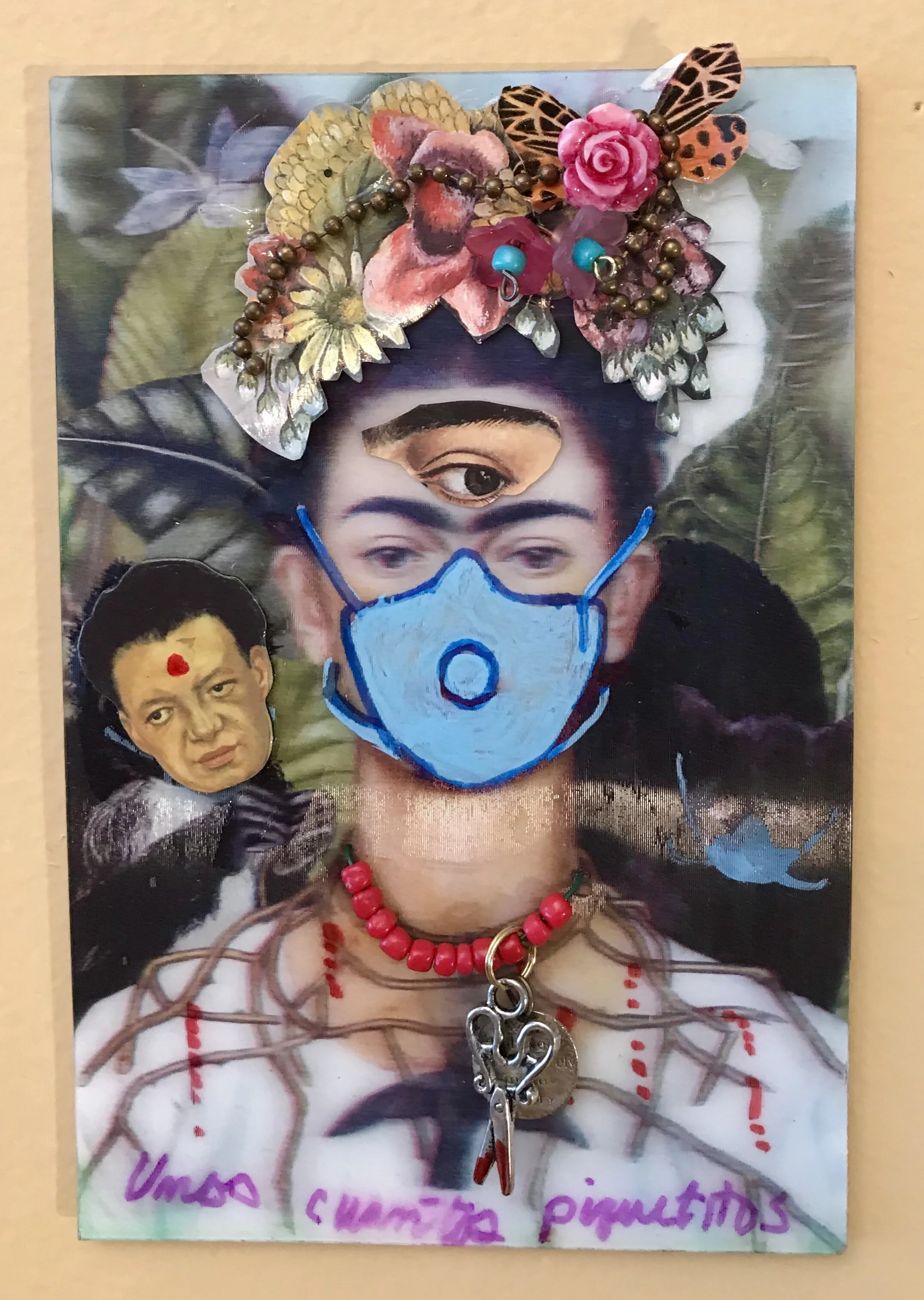 The work has layers many of depth. The post card plays with a sense of motion as you move it. The actual embellishments add another layer that makes it almost sculptural. As with all of Cynda’s work this piece is rich with symbolism and has a narrative. Frida Kahlo and the face mask have become the representation of the times we find ourselves in. Her perseverance in the face of insurmountable odds is going to inspire all us artists as we move forward into the unknown wearing our masks.